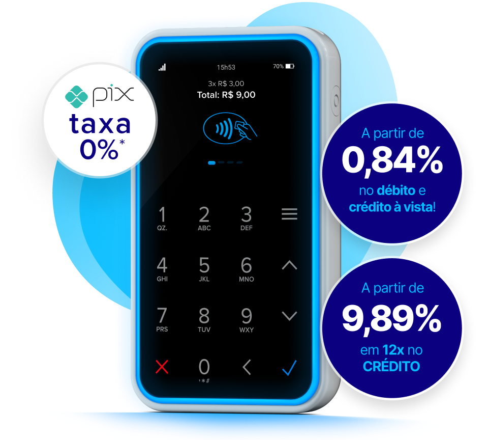 Aceita cartões, pagamento por aproximação, QR e Pix.